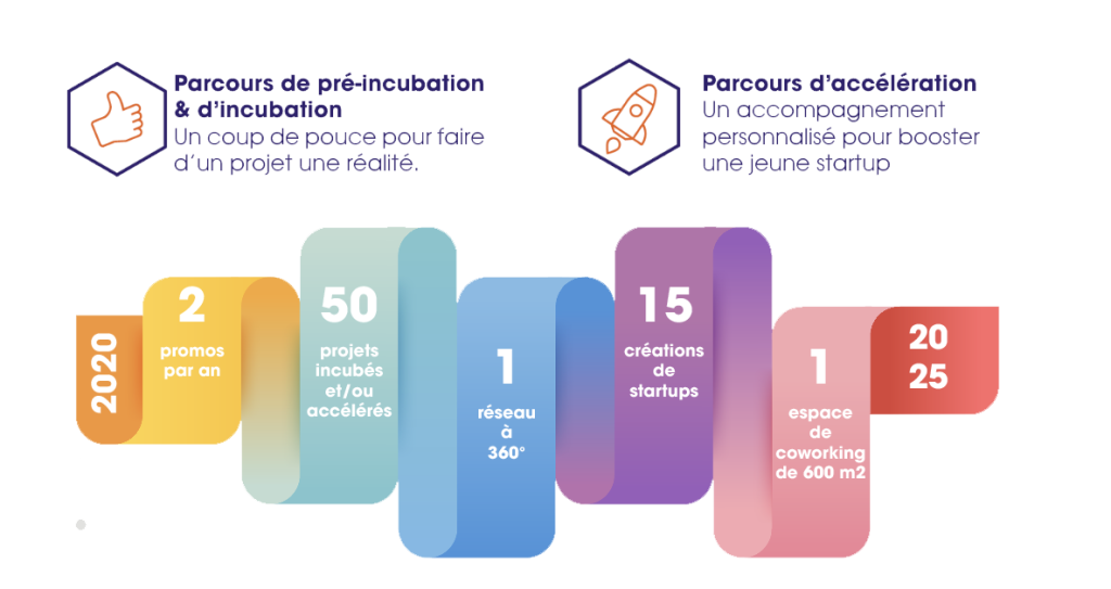 - Pré-incubation & incubation : pour valider l’idée, sécuriser le projet et trouver son modèle économique.