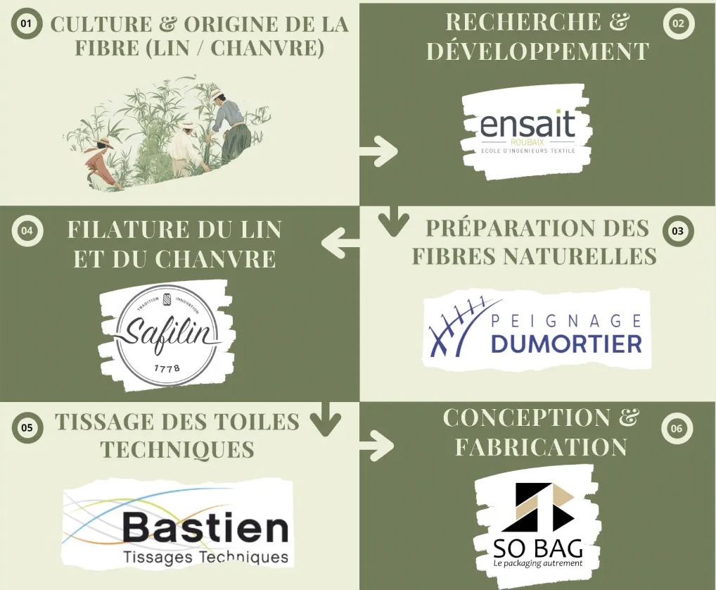Développement de big-bags 100 % biosourcés à partir de lin et de chanvre locaux, compostables ou recyclables, avec traçabilité environnementale intégrée. Production 100 % française, dans une logique circulaire et collaborative (agriculture, textile, logistique, R&D).